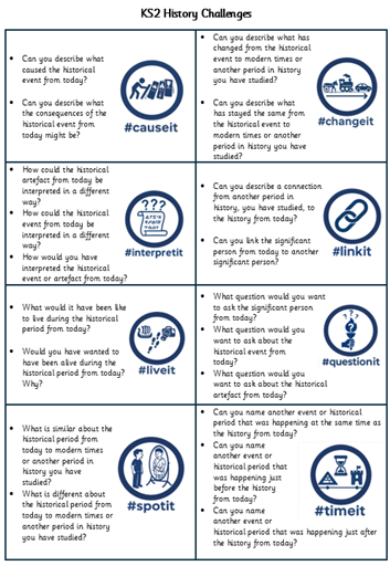 - #Hashtag Challenges – a range of challenges children can independently and with the support of an adult use to further their understanding in each lesson. Each challenge is based upon one of the key historical skills or concepts children learn